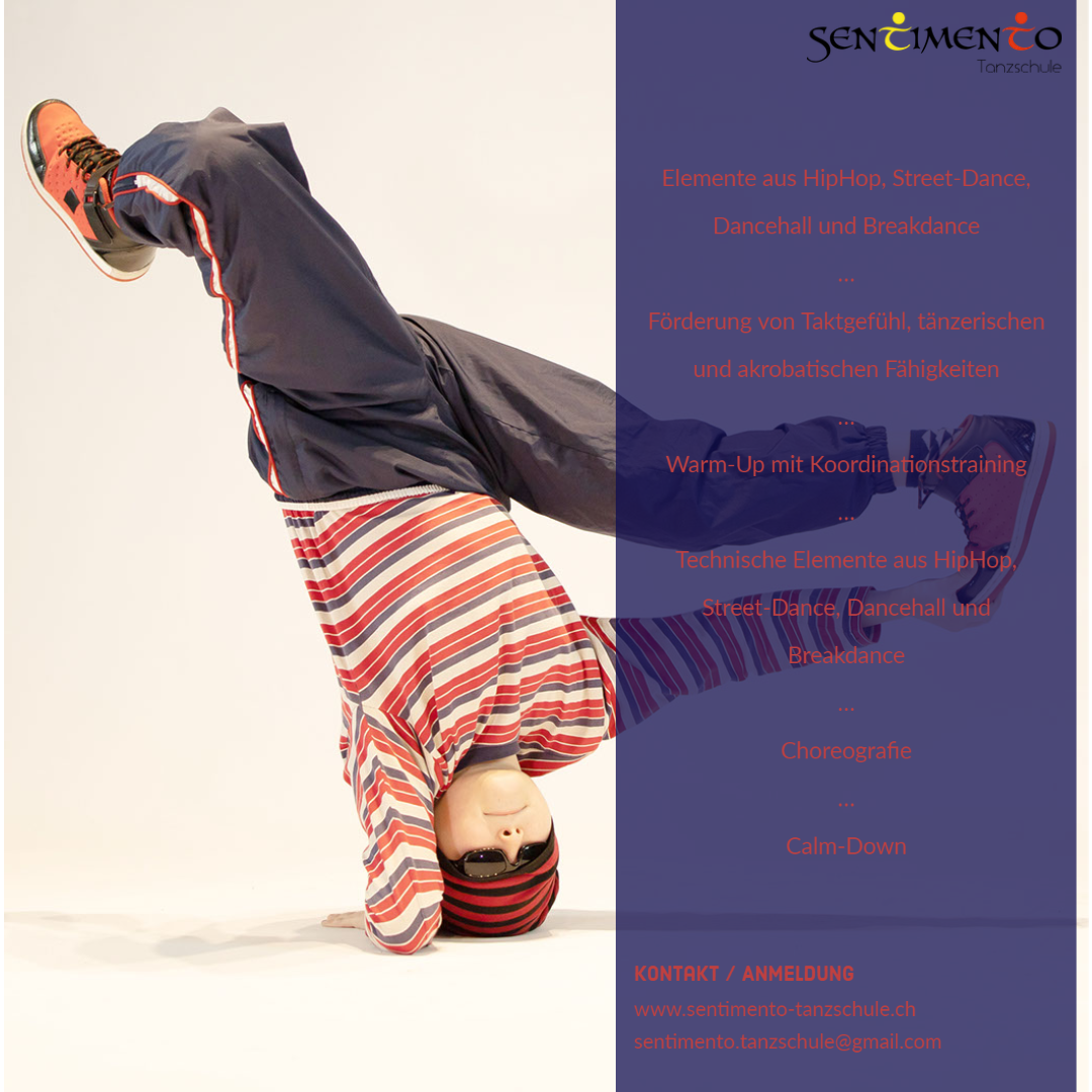 In dieser Tanzstunde werden Elemente aus HipHop, Street-Dance, Dancehall und Breakdance trainiert und in Übungen und Choreografien umgesetzt. Taktgefühl, tänzerische und akrobatische Fähigkeiten werden weiterentwickelt. Im Zentrum steht das Erarbeiten von Choreografien und ein dem Niveau jedes Teilnehmers entsprechendes Tanz-Training.